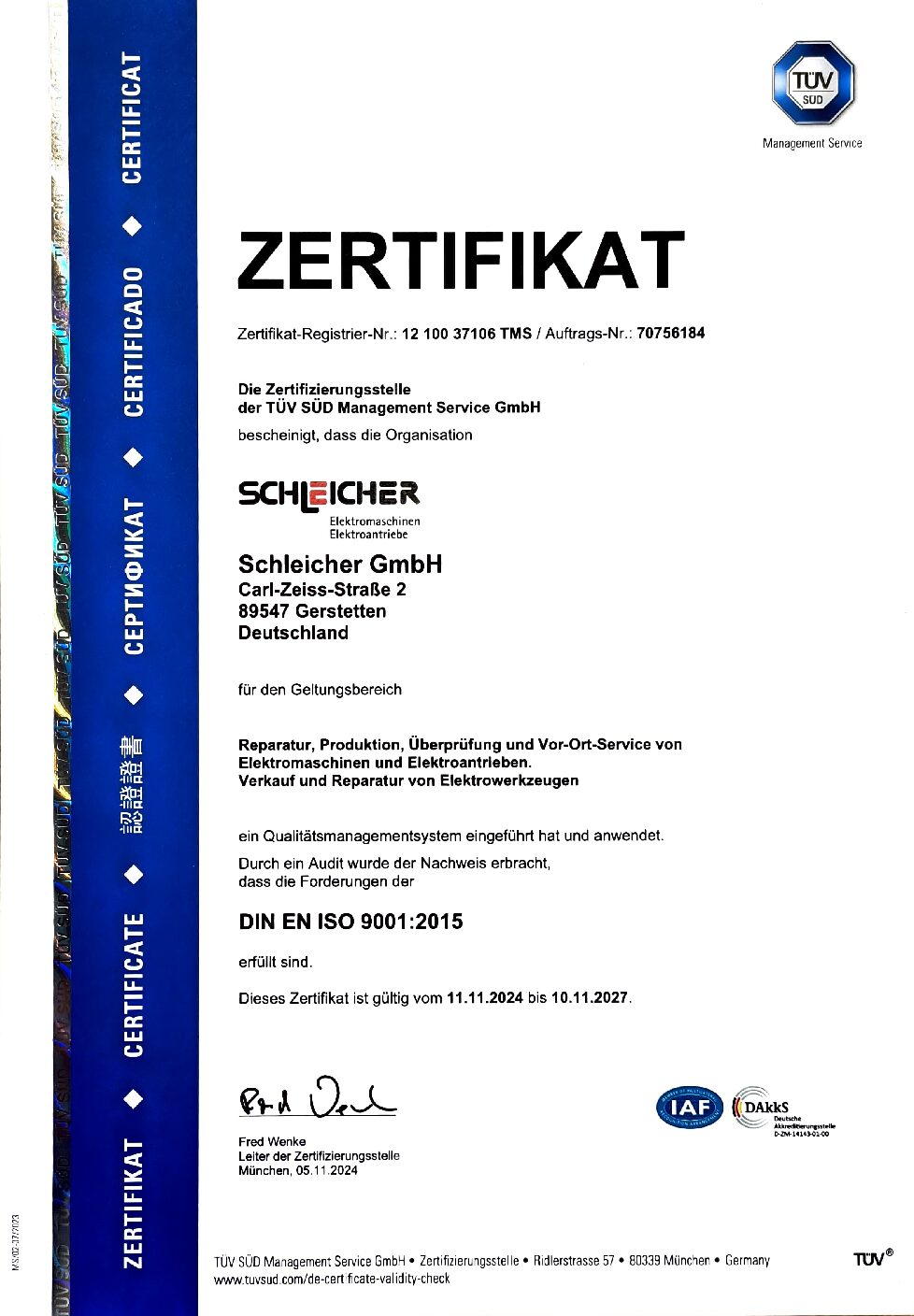 Bereits 2009 wurden wir mit der TÜV-Zertifizierung im Bereich Reparatur, Produktion, Überprüfung und Vor-Ort-Service von Elektromaschinen und Elektroantrieben für unser Qualitätsmanagement ausgezeichnet. Gleichfalls wurde das Zertifikat für den Verkauf und die Reparatur von Elektrowerkzeugen verliehen. Die Geschäftsleitung verpflichtet sich und alle Mitarbeiter, dieses System aktiv anzuwenden. Nur so gelangen einwandfreie Produkte, die unseren strengen, internen Qualitätsprüfungen standhalten, zum Kunden.